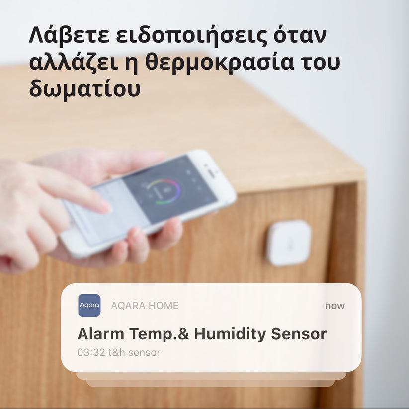 - Ειδοποιήσεις Θερμοκρασίας και Υγρασίας: Η εφαρμογή Aqara Home (iOS/Android) μπορεί να σας ειδοποιήσει αν η θερμοκρασία, η υγρασία ή η πίεση φτάσουν σε προκαθορισμένες τιμές.