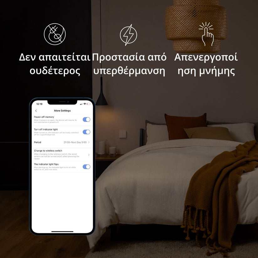 Αυτόνομη Λειτουργικότητα: Λειτουργεί ως κανονικός διακόπτης φωτισμού καθώς και ως έξυπνος, ιδανικό για μέλη της οικογένειας που δεν είναι εξοικειωμένα με το έξυπνο σπίτι. Δεν χρειάζεται να ανησυχείτε για διακοπές ρεύματος, εάν κάποιος απενεργοποιήσει κατά λάθος το hub ή αν διακοπεί το Wi-Fi, ο διακόπτης τοίχου H1 θα λειτουργεί ακόμα ως παραδοσιακός διακόπτης.
