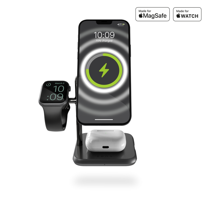 Ο σταθμός φόρτισης ZENS 4-σε-1 προσφέρει μια κομψή και πρακτική λύση για τη φόρτιση έως τεσσάρων συσκευών ταυτόχρονα με έναν ενιαίο, σχεδιασμένο μονόλιθο. Η υποδοχή MagSafe επιτρέπει γρήγορη ασύρματη φόρτιση έως 15 W για συσκευές όπως iPhone 12 και άνω, ενώ υπάρχει ξεχωριστή επιφάνεια φόρτισης για το Apple Watch και επιπλέον pad φόρτισης συμβατό με Qi. Η ενσωματωμένη θύρα USB-C 18 W καλύπτει και μια τέταρτη συσκευή, π.χ. iPad ή smartphone.