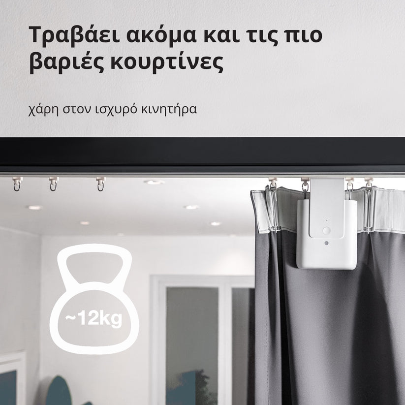 Μέγιστο Φορτίο 12 κιλών: Το Curtain Driver E1 μπορεί να τραβήξει ακόμη και τις πιο βαριές κουρτίνες: χάρη στο ισχυρό μοτέρ του, το μέγιστο φορτίο μπορεί να φτάσει έως και τα 12 κιλά!