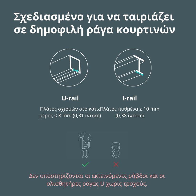 Υποστήριξη Δημοφιλών Ραγών Κουρτίνας**: Το Curtain Driver E1 υποστηρίζει σχεδόν κάθε τύπο ραγών ή ράβδων κουρτίνας. Η έκδοση Rod υποστηρίζει όλους τους τύπους, ενώ η πιο οικονομική έκδοση Track υποστηρίζει μόνο U- και I-Rails.